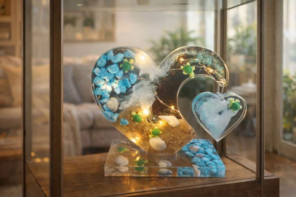 Handgefertigtes Epoxidharz-Herz mit Meeresmotiv, glitzernden Details und integrierter Beleuchtung. Einzigartiges Deko-Stück, das an Strand & Meer erinnert. Inklusive Mini-Herzanhänger. Jetzt nur 44,99€ – ideal als Geschenk!