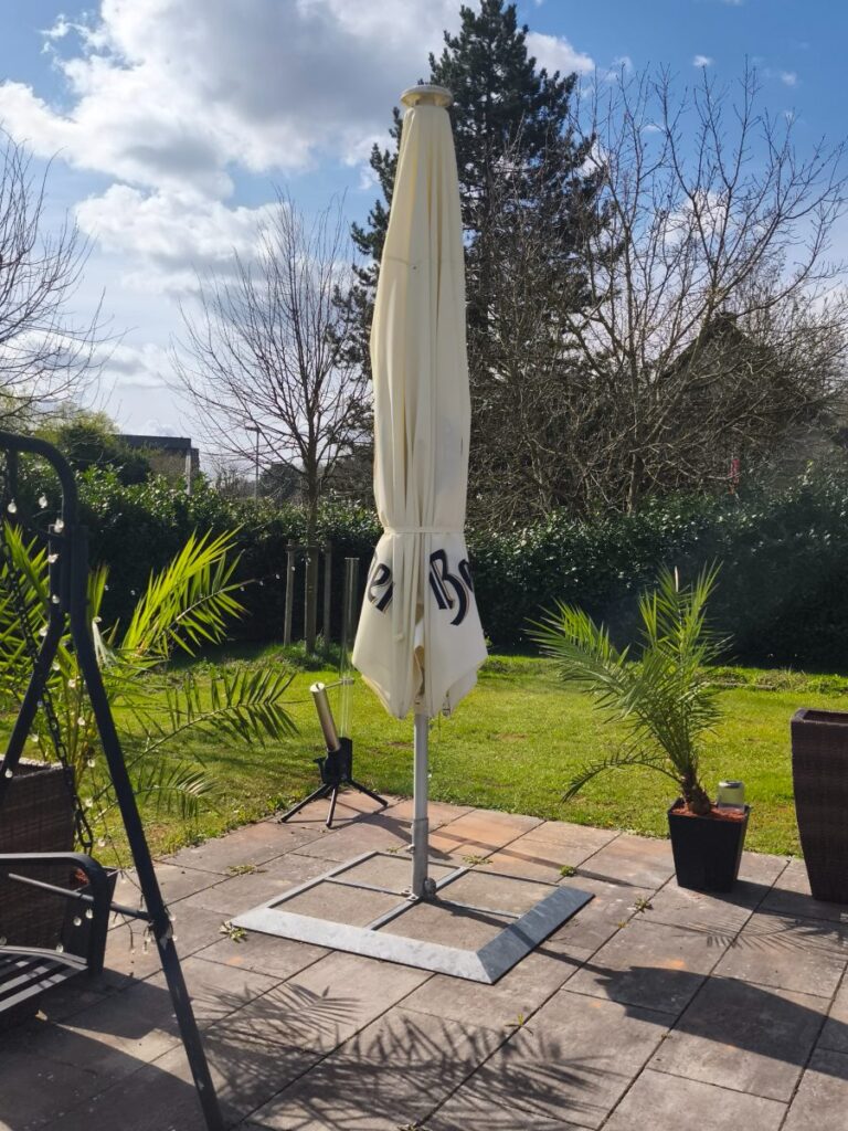 2x großer Gastro-Sonnenschirm mit stabilem Metallständer und Betonplatten. Ideal für Biergarten, Terrasse oder Events. Robuste Qualität. Gebrauchsspuren vorhanden. Preis pro Schirm: 250 € VHB.