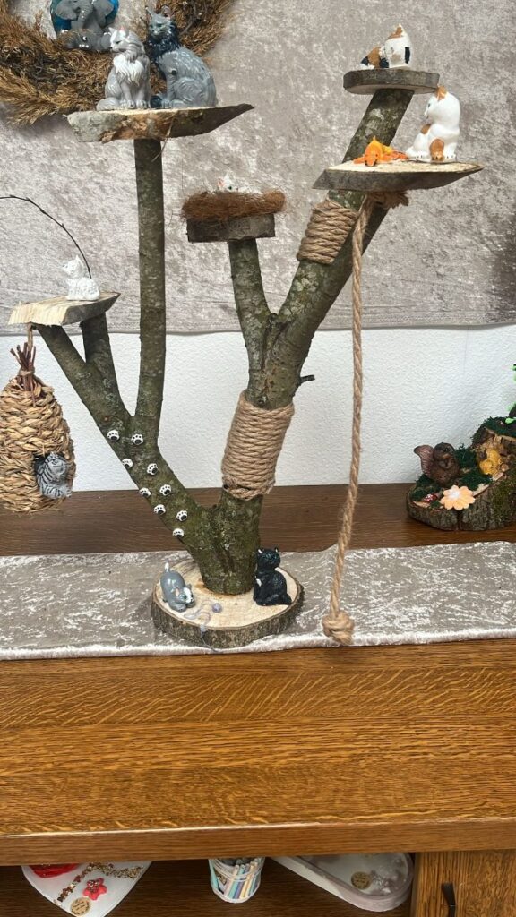 Einzigartiger Deko-Katzenbaum aus Naturholz, handgefertigt und liebevoll gestaltet. Perfekt für Tierliebhaber und ein Blickfang in jedem Raum! Für drinnen nd draußen geeignet. Inkl. Figuren. Preis:€99