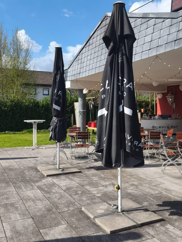 Robuster Profi-Sonnenschirm, ca. 2,5m Durchmesser, ideal für Gastronomie/Garten. Inklusive stabilen Betonplattenfuß. Gebrauchsspuren vorhanden. Perfekter Sonnenschutz für Terrasse & Biergarten! Nur 80€ (NP ~250€)